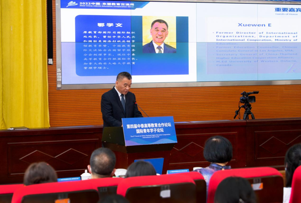 中泰高等教育合作联盟鄂学文秘书长致开幕辞,期望本次论坛能够推动更多的优秀青年登上世界的舞台,各国学子广泛交流思想,建立友谊,凝聚共识,共同成长。承诺中泰高等教育合作联盟永远是联系中泰两国高等教育和青年人的平台与桥梁,也是区域乃至世界和平与发展的维护者和推动者,希望本次活动能够向世界讲好青年人的故事、传播好青年人的声音!