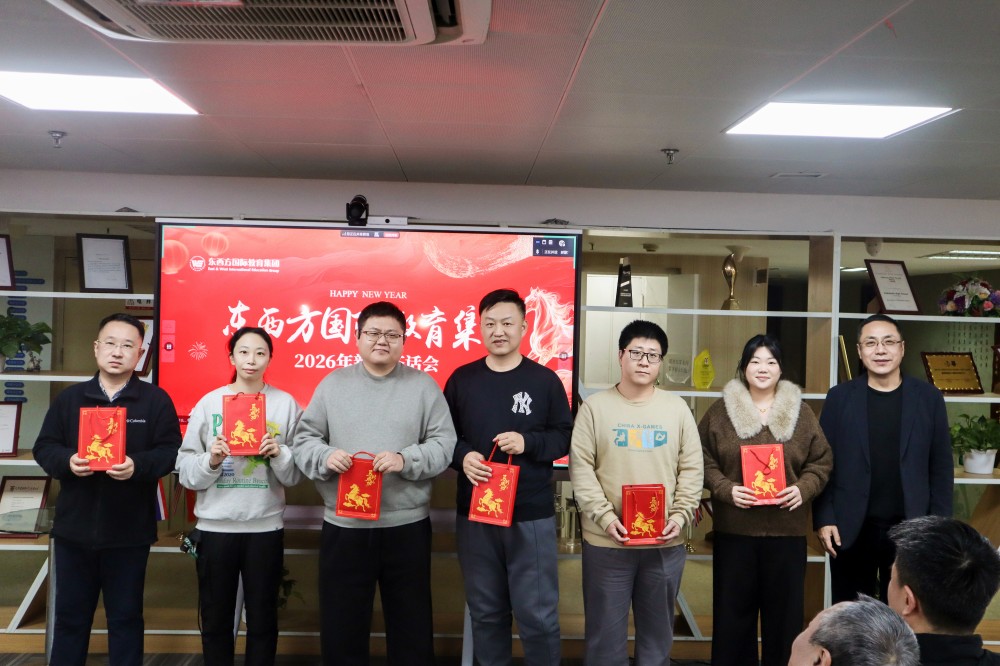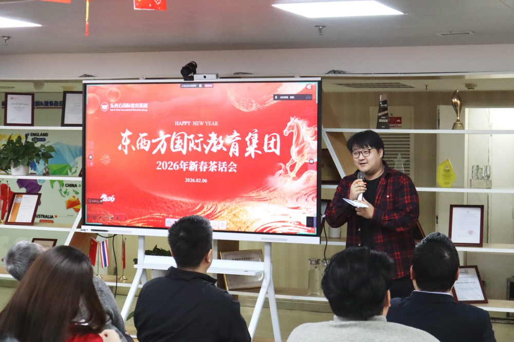 锦绣春明驰骏马,韶华风暖聚同心。为迎接2026丙午马年新春佳节,传承企业文化、凝聚团队力量,东西方国际教育集团于2026年2月6日隆重举办新春茶话会。北京地区全体员工齐聚一堂、共话情谊,上海、武汉、青岛、广州、成都、济南、重庆、西安、南宁等各地区员工通过线上连线的方式同步参与,隔着屏幕传递祝福、凝聚同心,整场活动暖意融融、喜乐祥和,处处洋溢着团圆奋进的喜庆氛围。