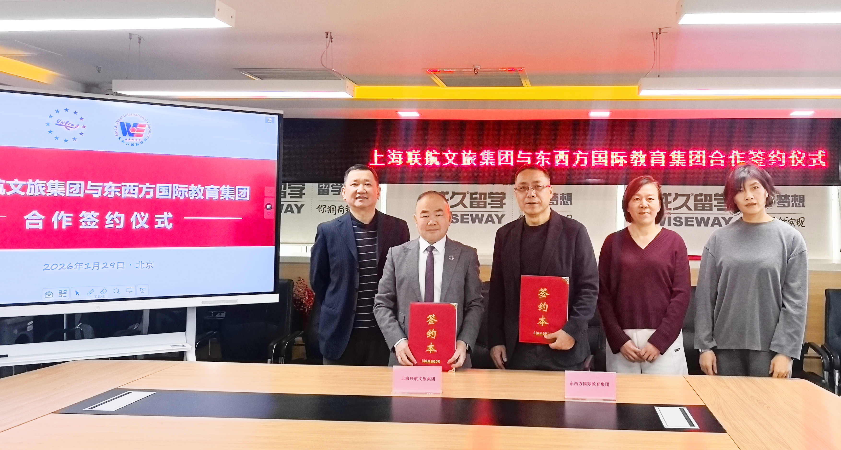 2026年1月29日,东西方国际教育集团与上海联航文化旅游集团有限公司在北京和盛大厦11层正式签署战略合作协议。此次合作标志着双方在研学出行与综合文旅服务领域迈出重要一步,也为境内外教育出行服务的协同发展注入了新的动能。